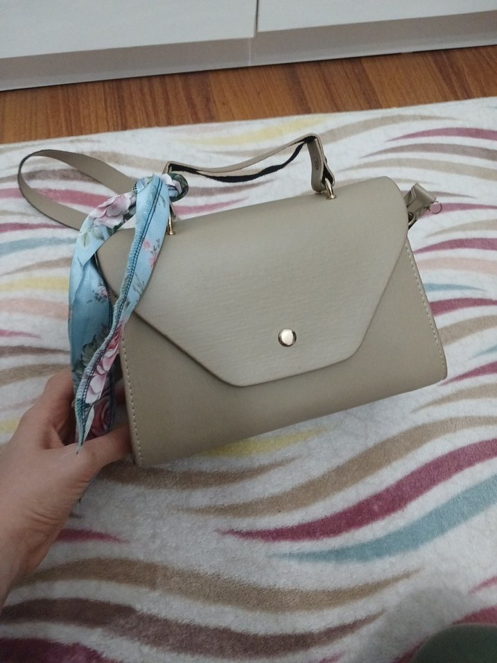 Bej renkte, tokalı kapaklı, yumuşak sentetik kumaştan yapılmış bohem tarzda desensiz kadın çantası. Sapına bağlanmış çiçek desenli fular içerir.