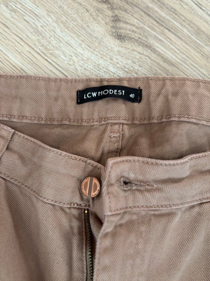 Bej renkte, düğmeli, bol kesim ve normal midi boyda, yumuşak kumaştan kadın boyfriend pantolon.