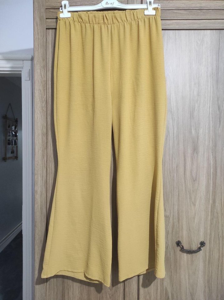 Bej renkli, bol kesim ve pile detaylı keten kumaştan yapılmış uzun pantolon. Günlük kullanıma uygun rahat ve şık bir model. sorunsuz