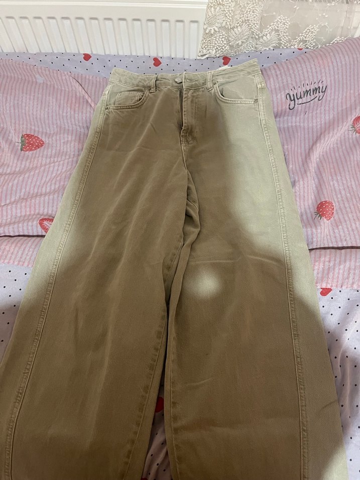 Bej renkli, pamuklu, bol kesim kadın jean. Düğmeli ve midi boyda, günlük rahat kullanım için uygundur. Sokak stiline uygun pastel tonlarda.