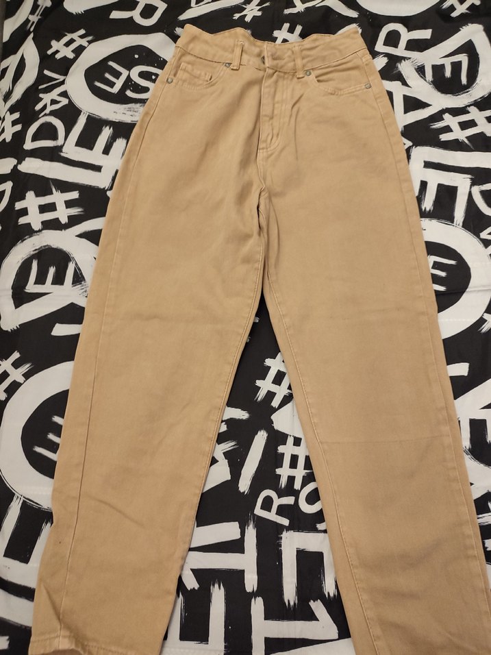 Bej renkli, bol kesim, pamuklu kumaştan yapılmış kadın kot pantolon. Midi boyu ve sade tasarımıyla günlük kullanıma uygun, rahat ve şık bir seçenek. ✨ ürünün bir parçasında çizgi var kumaş hastasıdır aldığımda böyleydi