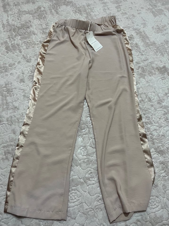 Bej renkli, bol kesim midi uzunlukta, kemerli ve yanları saten şeritli, yumuşak ve ipeksi kumaştan kadın pantolonu.
