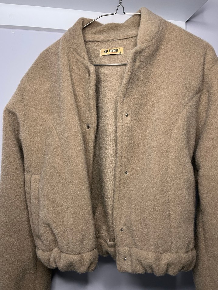 Bej renkli, kürk detaylı kadın ceket. Uzun kollu, yuvarlak yaka ve bol kesimdir. Yumuşak ve sıcak kumaştan yapılmış, normal midi boyda bir modeldir.