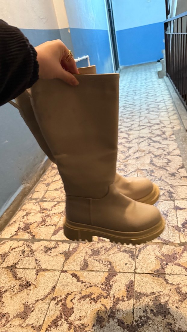 Bej renkli, tokalı ve kalın topuklu diz boyu botlar. Dayanıklı kauçuk malzemeden üretilmiş, desen içermeyen bu botlar günlük kullanıma uygundur. 36 no