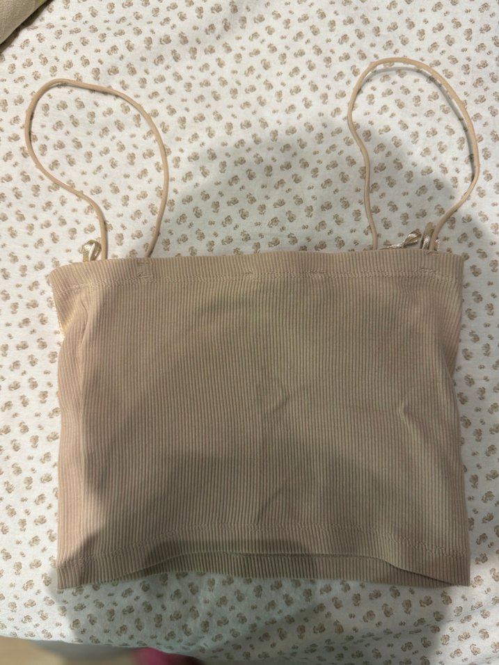 İnce askılı, bej renginde, minimal tarzda kadın bralet. Sokak modasına uygun, normal boyda ve dokulu kumaştan.