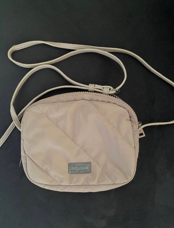 Sentetik kumaştan yapılmış, fermuarlı bej kadın çapraz askılı çanta. Minimalist tasarıma sahip, günlük kullanım ve sokak stili için uygundur. "PUCISBEAR" etiketi bulunur.