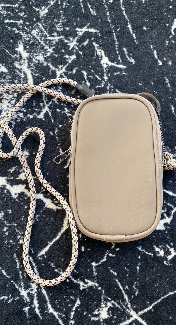 Bej renkte, zincir detaylı ve sentetik kumaştan yapılmış çapraz çanta. Düz ve desen içermeyen tasarımı günlük sokak stili için uygun, Paris esintili.