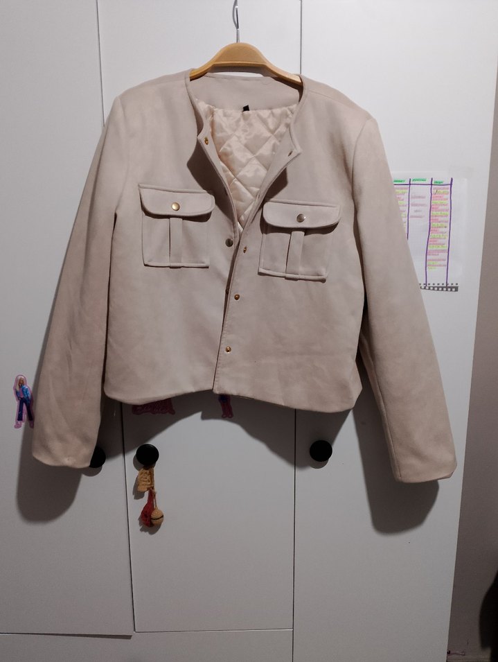 Bej renkli süet kumaştan, uzun kollu, düğmeli ve normal kesim midi ceket. İki cep ve desen içermeyen sade tasarımıyla günlük kullanıma uygundur. Beden Xl, az giyildi.