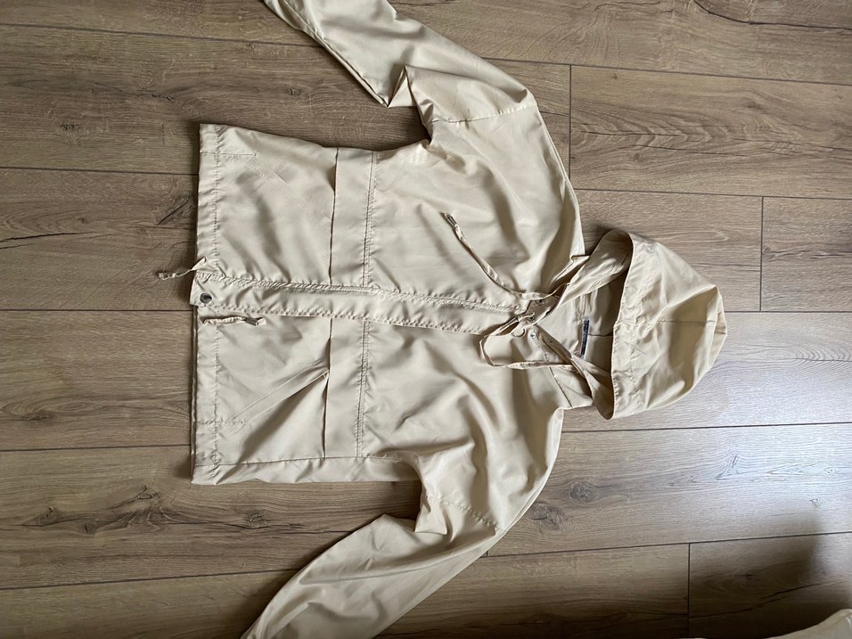 Bej keten kumaştan, normal boy midi uzunluğunda, bol kesim kadın ceket. Notch yaka ve kollu, minimalist sokak stili için uygun.