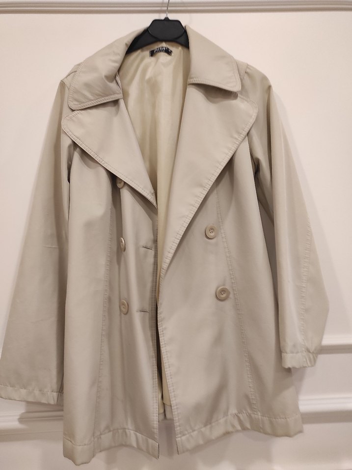 Bej renginde, düğmeli ve normal boy midi trençkot.