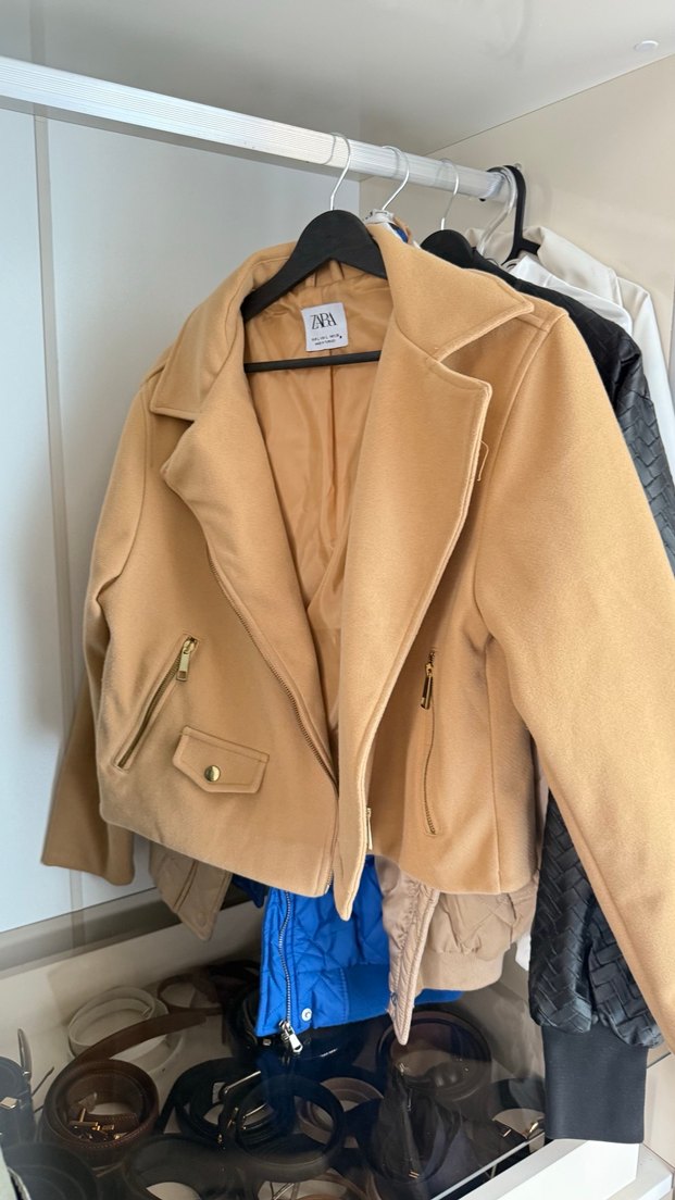 Bej kumaştan yapılmış, çıtçıtlı yakalı ve fermuarlı cepli, normal kesim, askılı kollu kadın ceket. Orj zara değil, muadil