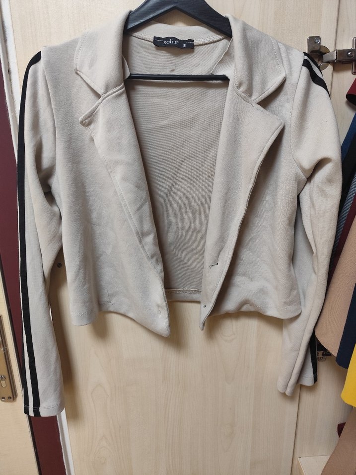 Bej süet kumaştan mini blazer, yakalı, düğmeli ve uzun kolludur. Sade ve günlük sokak stiline uygundur.