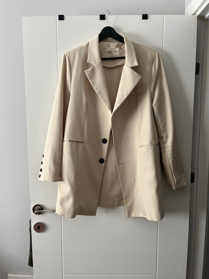 Bej kadın ceket, düğmeli ön ve kesik yaka ile. Hafif kumaştan, normal kesim ve uzun kollu, ofis için uygun.
