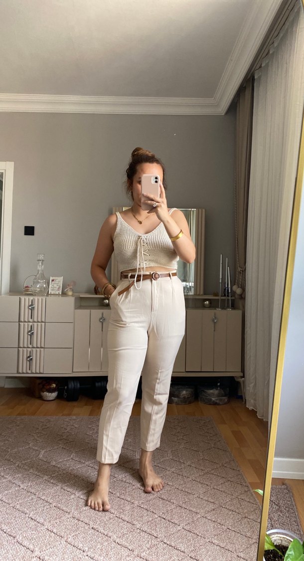 Bej renk, ince kesim pamuklu cigarette pantolon. Minimalist ve trend casual tarzıyla günlük kullanıma uygun, zahmetsiz şıklık sunar.