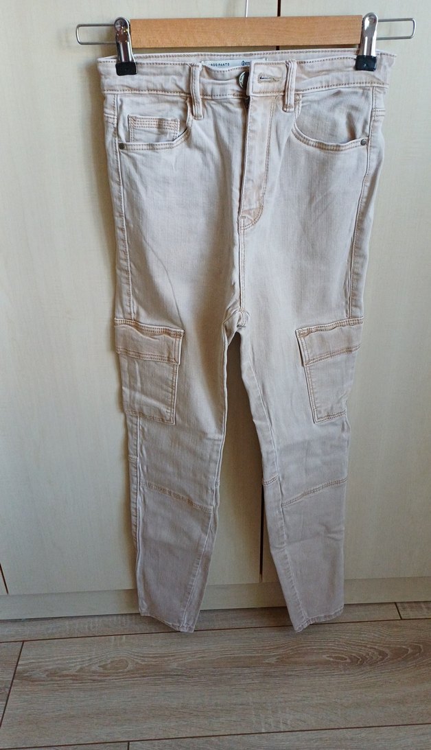 Bej renkli, kargo denim pantolon. Desensiz, gündelik kullanım için rahat ve şık bir modeldir.