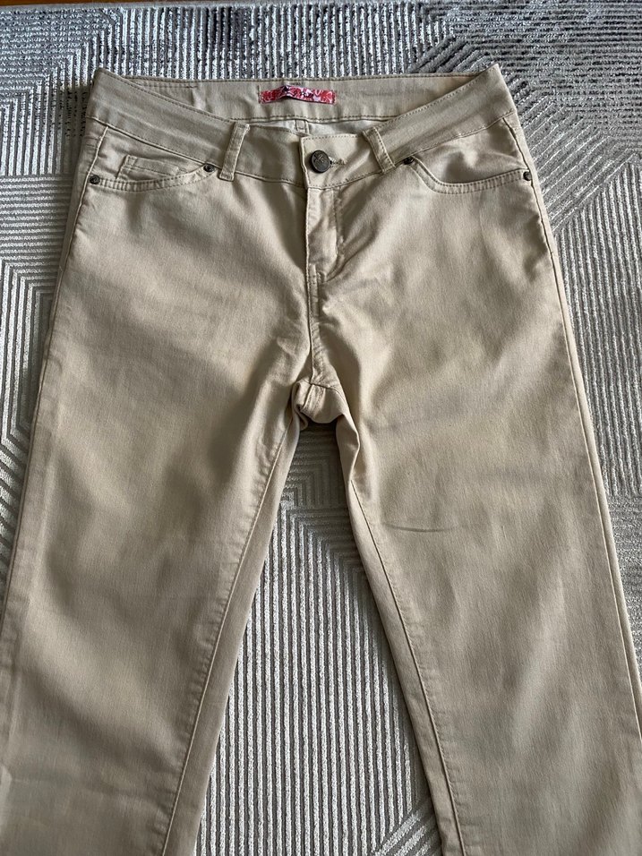 Bej renkte, normal boyda ve regular fit kesime sahip kadın denim pantolon, günlük rahat kullanıma uygun şık ve sade tarzda.