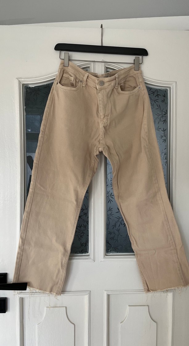 Bej renkte, regular fit ve midi boyda denim pantolon. Günlük kullanıma uygun, pastel tonlu ve desensiz, zahmetsiz şıklık sunar. Orjinal topshop ürünüdür