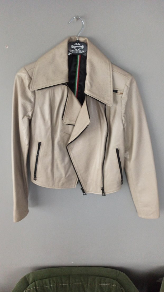 Bej renkte kısa kesim, deri biker ceket. Notched lapel yaka, fermuarlı cepler ve askılı kollara sahip, rahat kesim.
