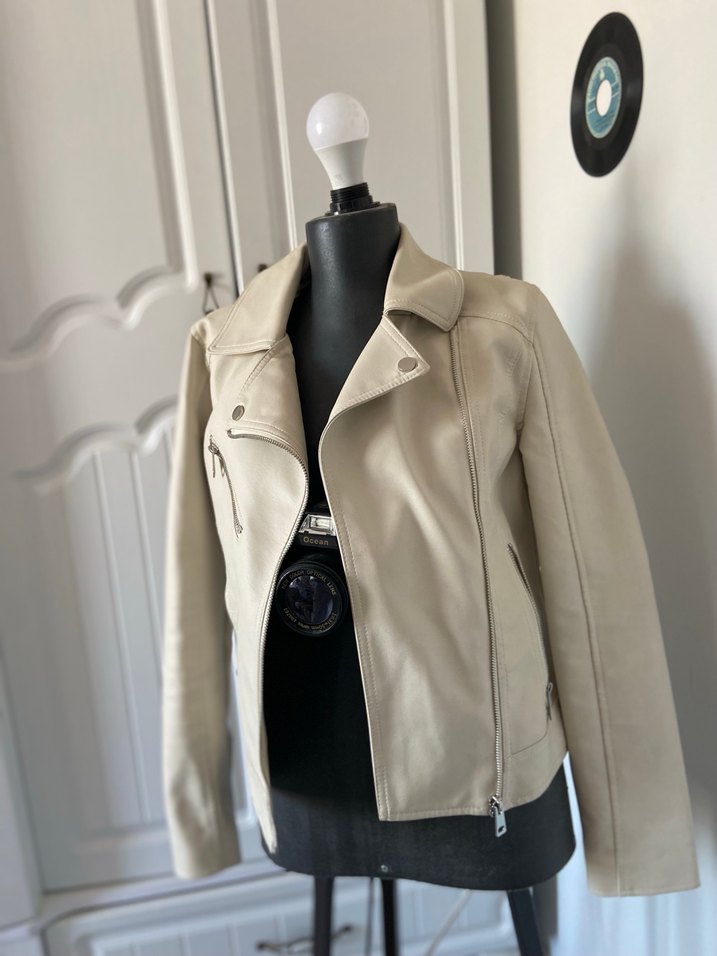 Bej renkli, kemerli beli ve kesik yaka detaylı deri biker ceket. Askılı kollara ve normal kesime sahiptir, günlük kullanıma uygundur.