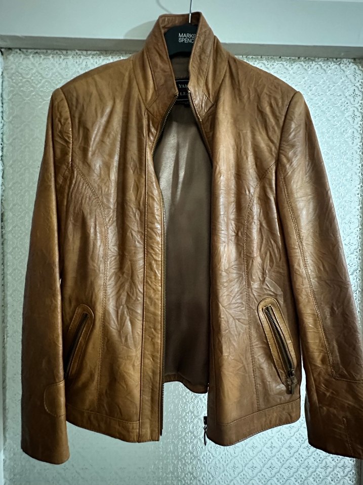 Taba renkli, deri biker ceket, normal boy ve uzun kolludur. Parlak yüzeye sahip, günlük kullanıma uygundur. Sıfır ayarındadır hiçbir hatası yoktur