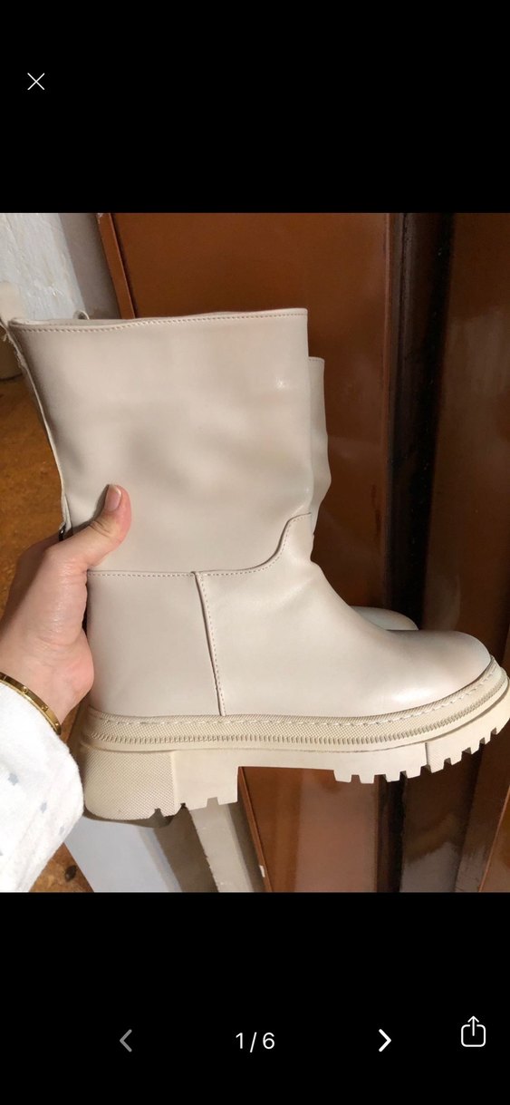 Bej renkli, deri botlar platform topuklu, gündelik kullanıma uygun şık ve rahat bir tarz sunar. Bi kez giydim o da arabayla bi yere gittim 10 adım yere basmışımdır. Yepyeni geniş kalıplı