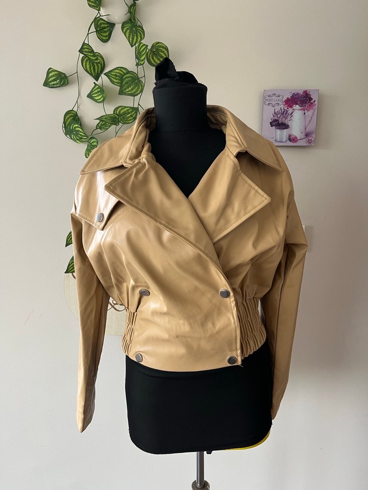 Bej renkli, düğmeli, kısa deri ceket. Notlu yaka ve askılı kolları ile günlük kullanıma uygun, parlak görünümlü midi boy ceket.
