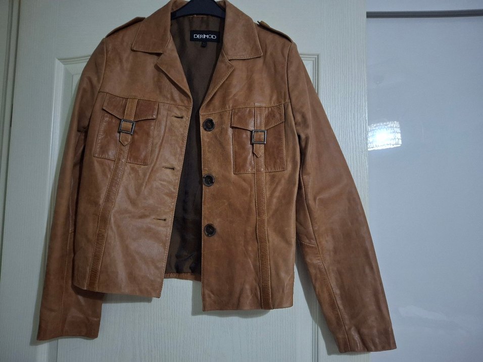 Bej renkte, düğmeli, notched lapel yakalı deri ceket. Uzun kollu, normal ve midi boyda, günlük kullanıma uygun klasik tarzda.