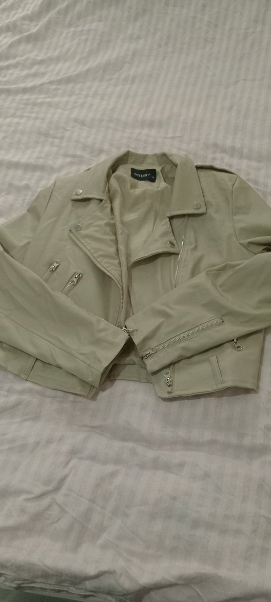Bej renkli, düğmeli, notalı yaka kadın deri ceket. Uzun kollu, normal kesim ve midi boyda, günlük rahat kullanım için uygundur.