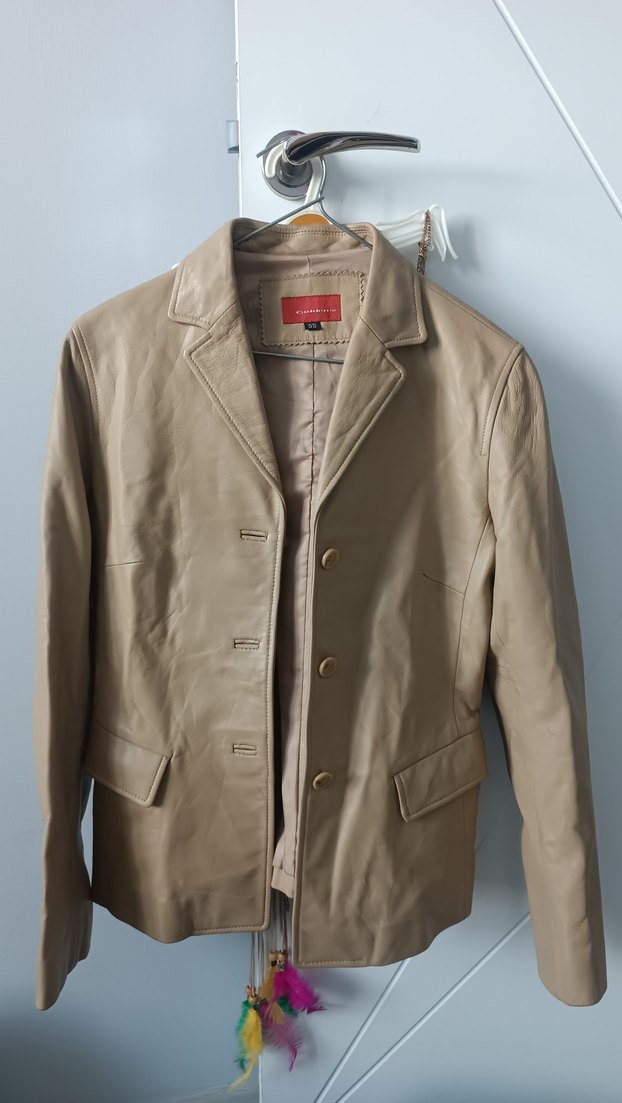 Bej kadın deri ceket, düğmeli ve normal boydadır. Notlu yaka ve uzun kolludur, klasik ve deseniz tasarıma sahiptir. Ofis için uygundur.