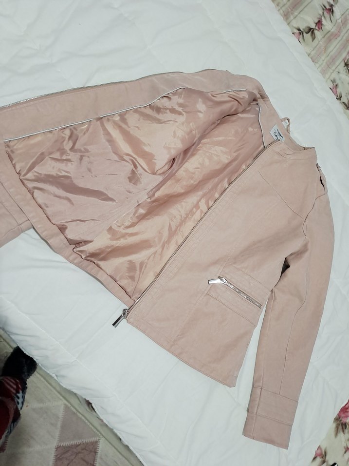 Bej renkli, sentetik kumaştan yapılmış, fermuarlı cepli, uzun kollu, minimal stil midi boy kadın deri ceket. Günlük sokak stiline uygundur.