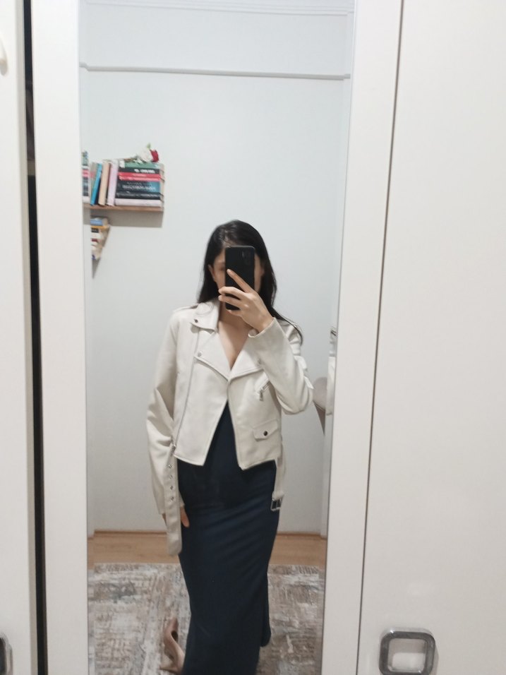 Bej renkte, notç yakalı ve fitted kesime sahip deri ceket. Uzun kollu ve midi boyda, minimalist ve şık bir görünüm sunar. Ofis kullanımı için uygundur.