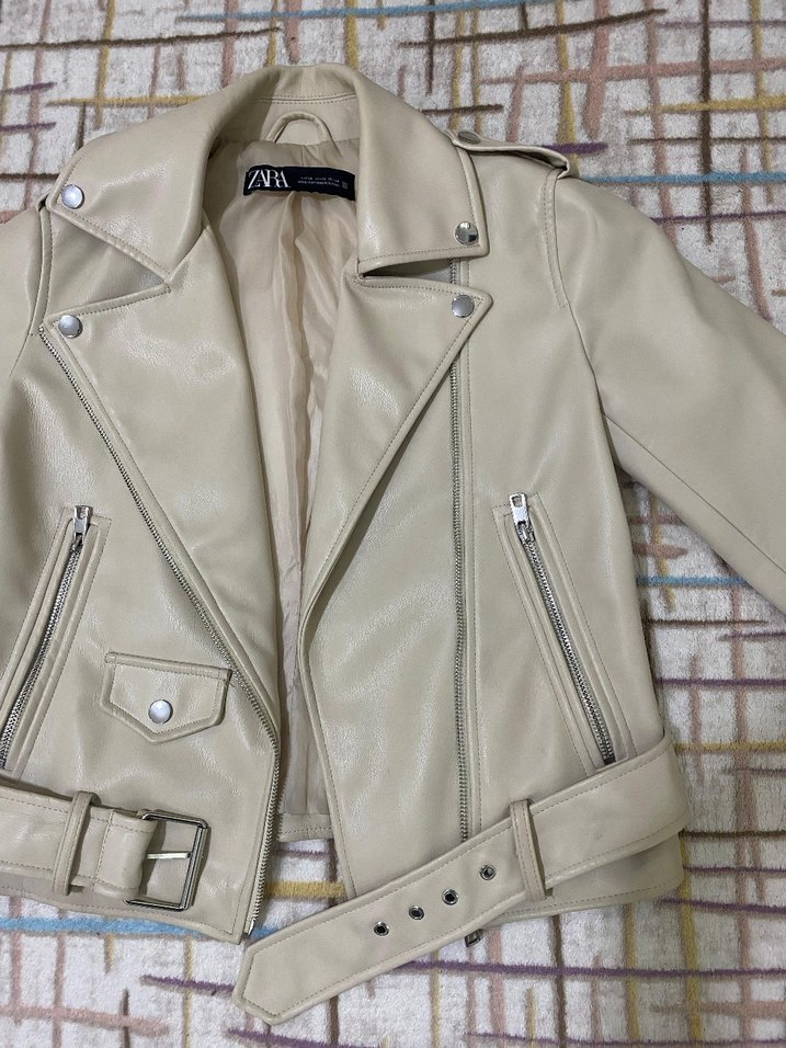Bej renkli, tokalı deri ceket. Notlu yaka ve normal kesim ile günlük sokak stili için uygun midi boyda.