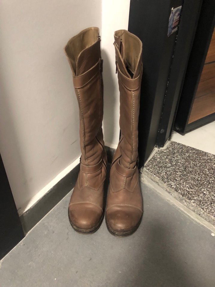 Bej renkli deri dizüstü botlar, kama topuklu ve tokalı detaylara sahip, sokak stili ve avangard moda tarzını yansıtıyor.