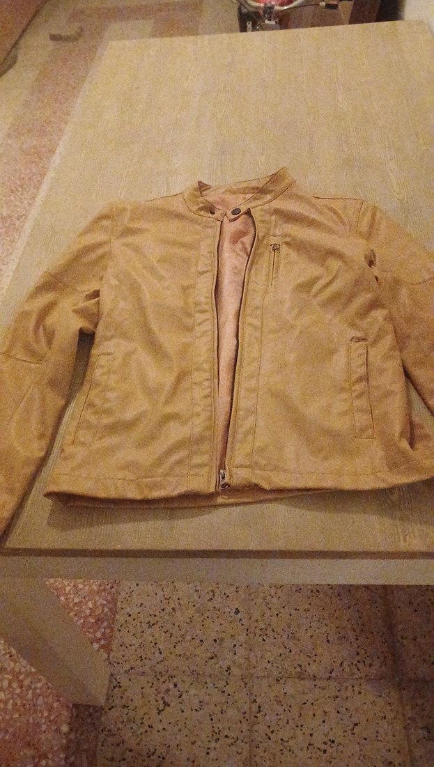Bu bej renkli, parlak deri ceket, fermuarlı ön, kesimli yaka ve uzun kollu olup günlük rahat kullanıma uygundur.