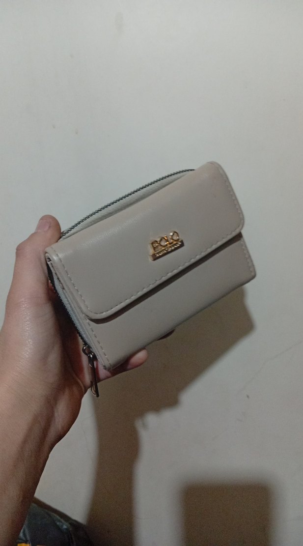 Bej renkte deri cüzdan, fermuarlı ve baskılı detaylara sahip. Günlük kullanım ve minimalist tarz için uygun, trend sokak modasına uyum sağlar.