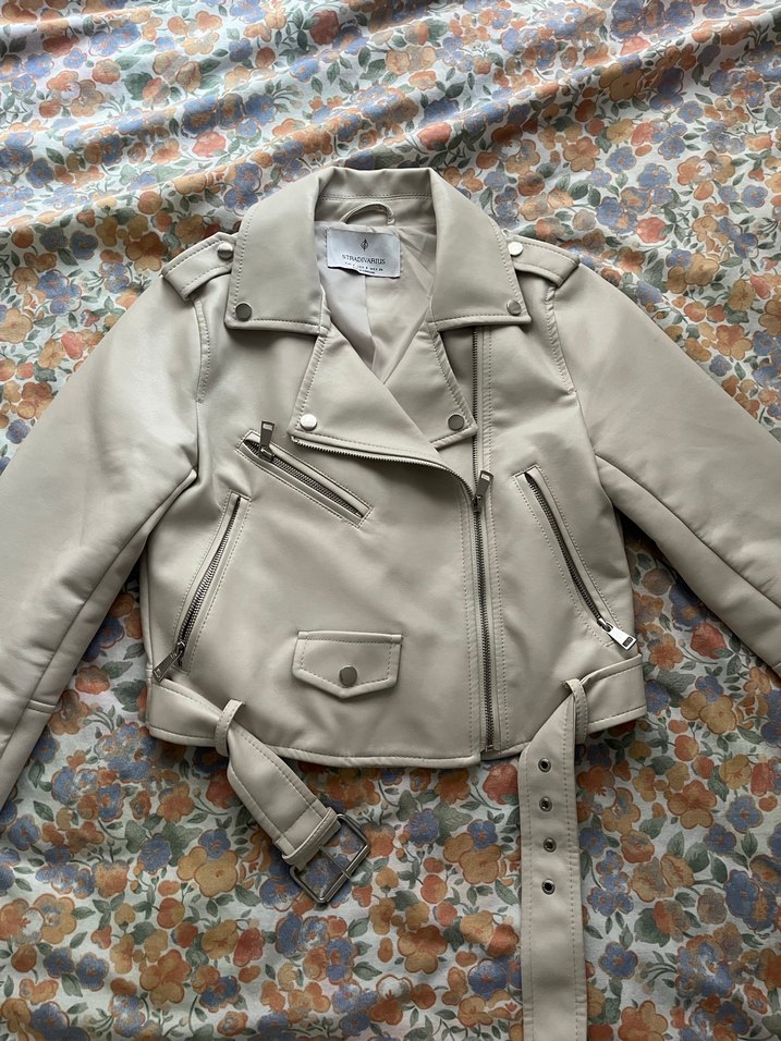 Bej deri, kemerli, çıtçıtlı, normal kesim, notched lapel yakalı kadın ceket.