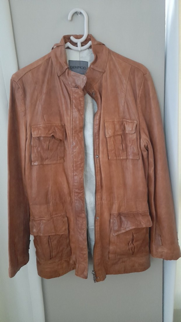 Kahverengi kadın deri ceket, kemerli ve kesik yakalıdır. Normal kesim, uzun kollu ve çok cepli. Parlak yüzeyli, midi boy, günlük kullanıma uygun.