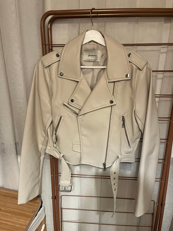 Hic kullanılmadı etiketi kesildi. Bej deri ceket, yakalı ve kemerli tasarımıyla şık bir sokak stili sunar. Normal kesim ve askılı kollarıyla günlük kullanıma uygundur.