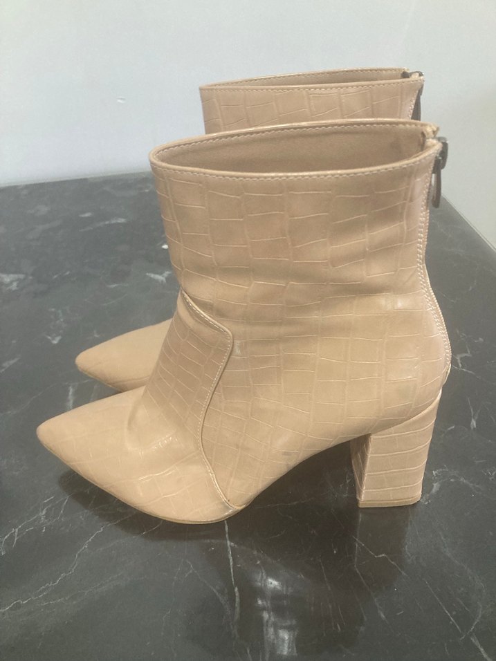 Bej renkli deri, kroko desenli ve topuklu botlar, günlük kullanıma uygundur.