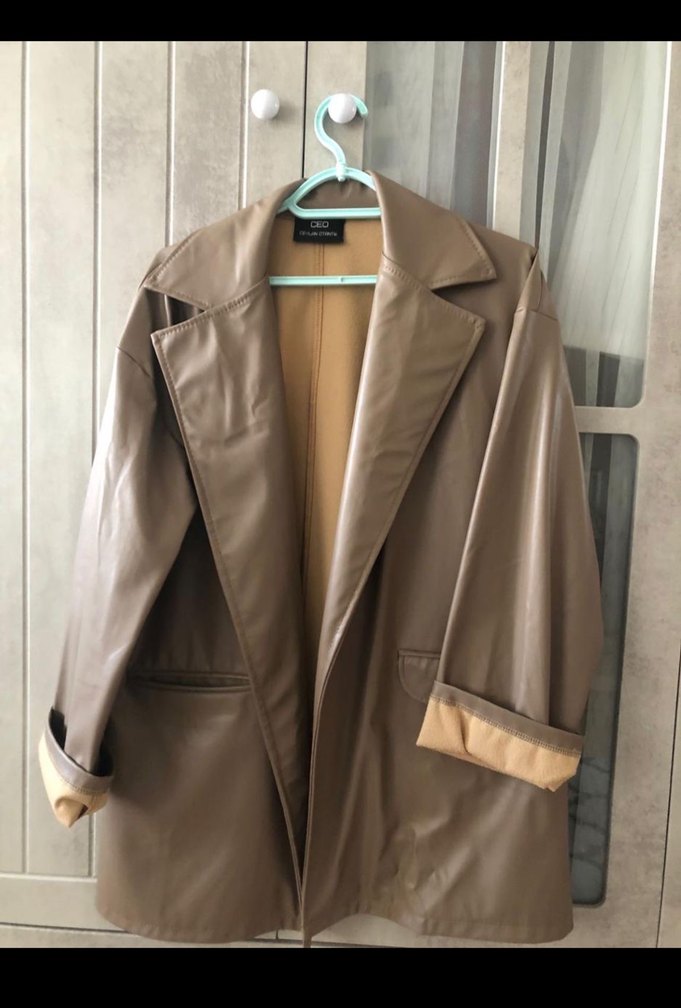 Bej deri ceket, kesik yakalı ve kemerli. Regular fit, askılı kol ve midi boy tasarıma sahip, günlük sokak stili için uygun.