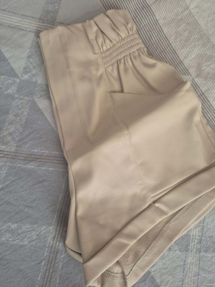 Bej kadın deri mini şort, regular fit, pileli tasarıma ve kısa boy uzunluğuna sahip. Günlük athleisure ve streetwear tarzlarına uygundur.