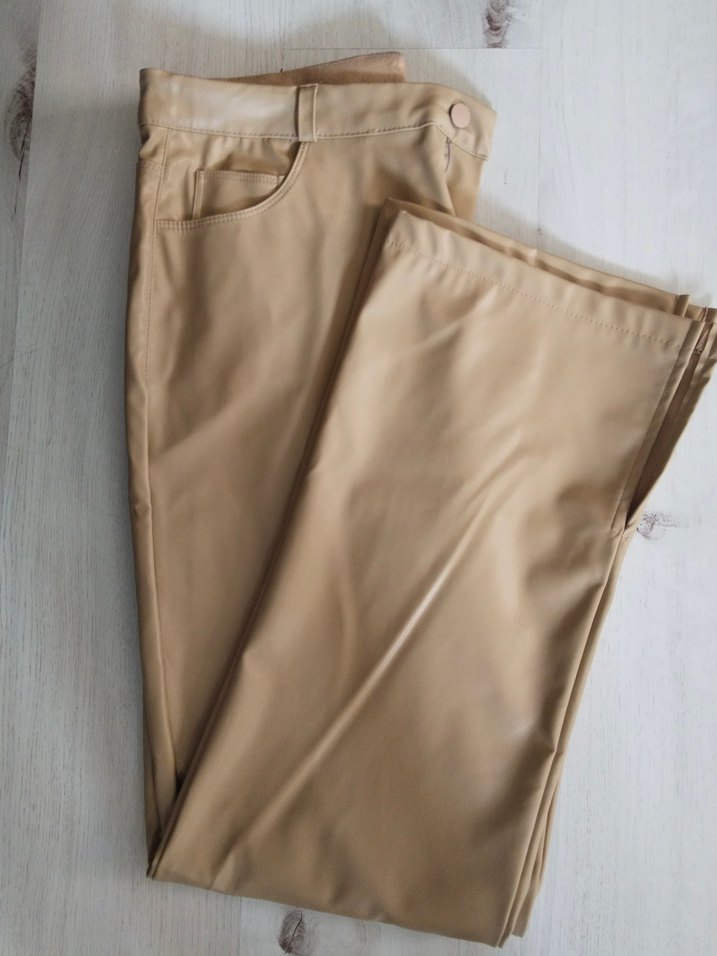 Bej renkte, normal boy deri pantolon. Düz, parlak yüzeyli ve rahat kesim, ofis ve sokak modasına uygun.
