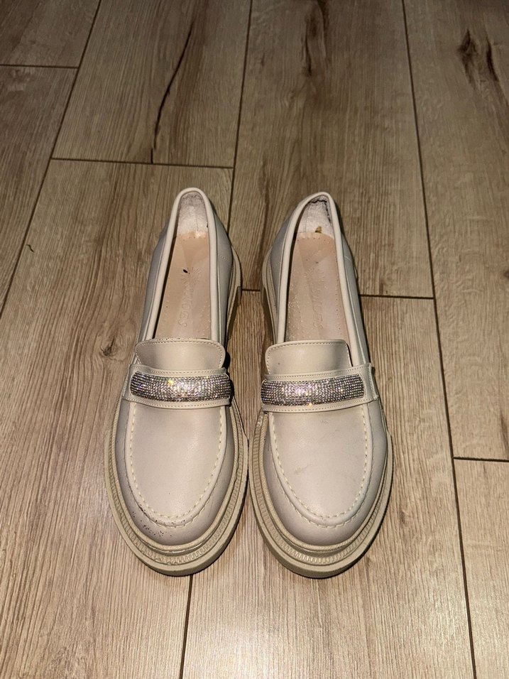 Bej deri kadın loaferlar, platform topuk ve tokalı detay ile günlük kullanıma uygun, trend ve çağdaş bir stile sahiptir.