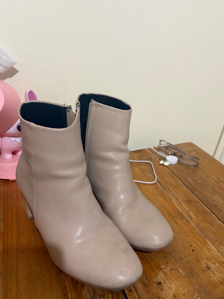 Bej renkte, deri malzemeden yapılmış, blok topuklu ve tokalı kadın botları. Günlük kullanıma uygun, sade ve şık.