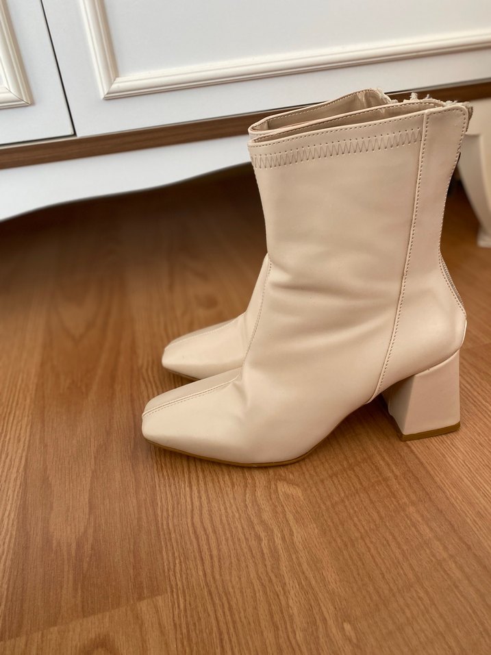 Bej renkli, deri kadın bot. 2 defa falan giydim, fermuar kısmında beklemekten lekeler oluşmuş fakat yıkayınca geçecek lekelerdir. Stradivarius model