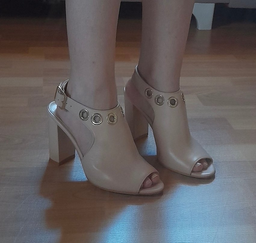 Bej deri kadın sandalet, topuklu ve tokalı. Minimalist tarzda, kul gözü detaylara sahip, günlük kullanıma uygun. çok iyi durumda az kullanıldı rengi pembe tonlu
