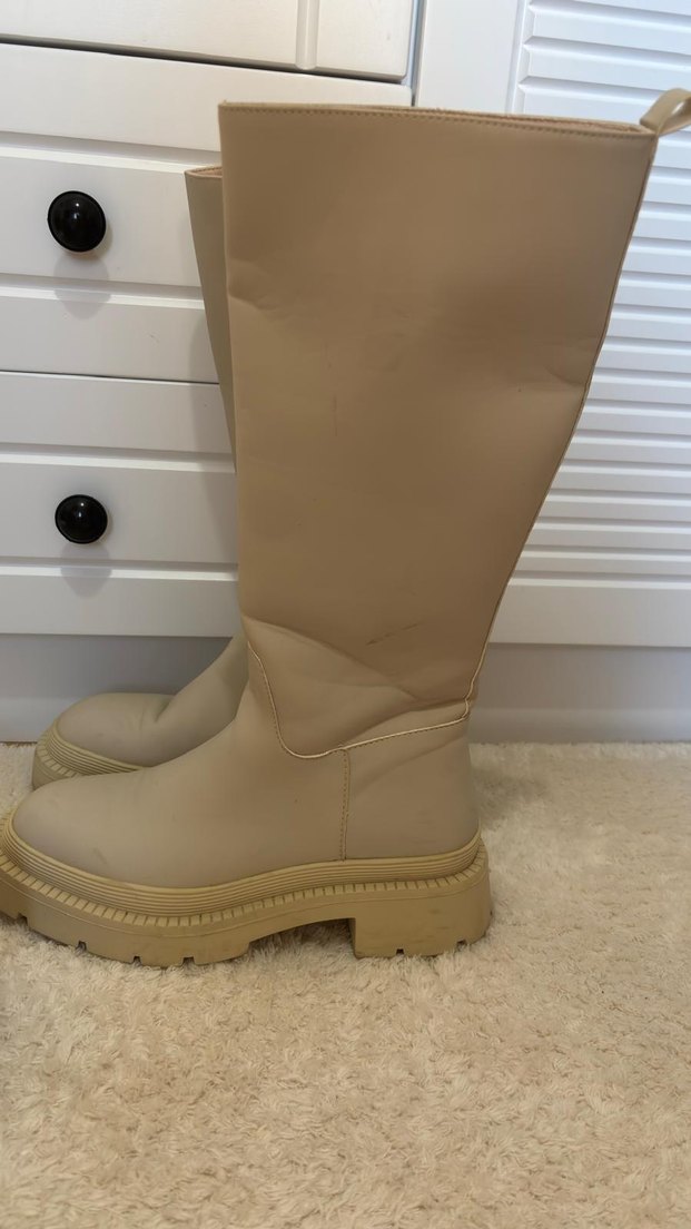 Bej renkte, kauçuk malzemeden yapılmış dizüstü platform topuklu botlar. Desensiz tasarımıyla rahat ve şık, günlük kullanıma uygundur. 38 numara çok kullanılmadı temiz duruyor fakat bir tarafında arkasında ufak açılma var son görselde görünüyor bu şekilde satılık.
