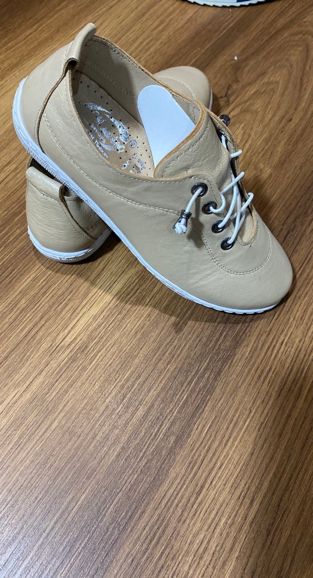 Bej renkli, dolgu topuklu ve lastik bağcık detaylı kadın deri günlük ayakkabısı, deri malzemeden üretilmiştir.