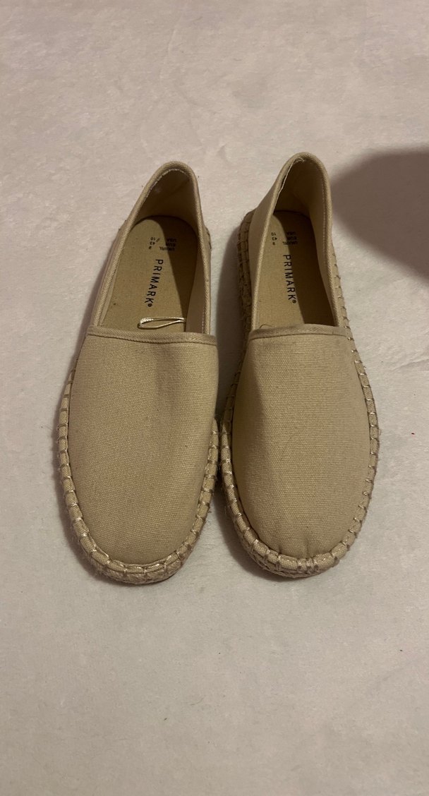 Bej kadın espadril, dolgu topuklu ve desen içermeyen minimalist tasarıma sahip. Kauçuk tabanlı, günlük kullanım için rahat ve şık. Marka: PRIMARK.