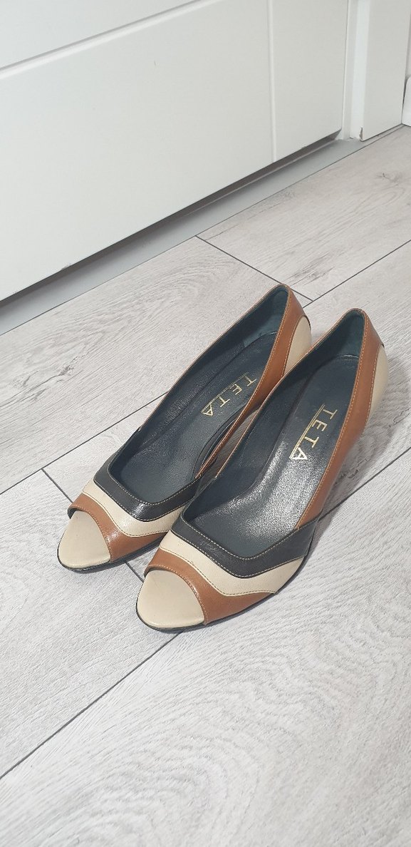 Bej renkli, kemerli ve dolgu topuklu kadın klasik ayakkabısı. Kauçuk malzemeden üretilmiş, ofis kullanımı için uygun çağdaş bir stile sahip. Açık renk ve desensiz.